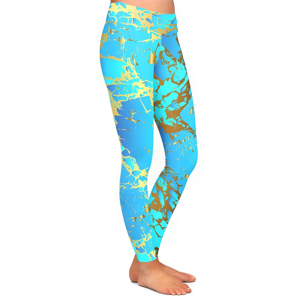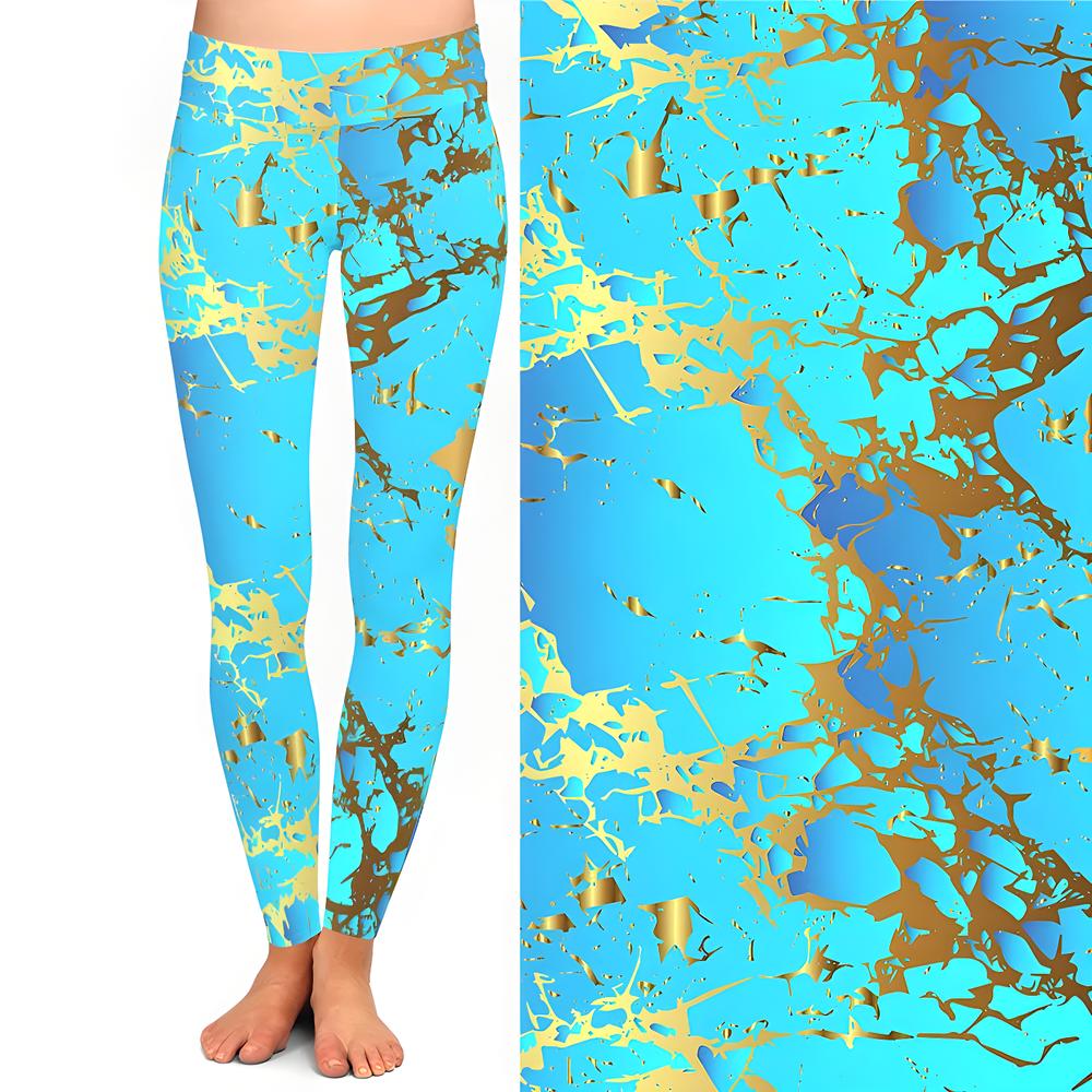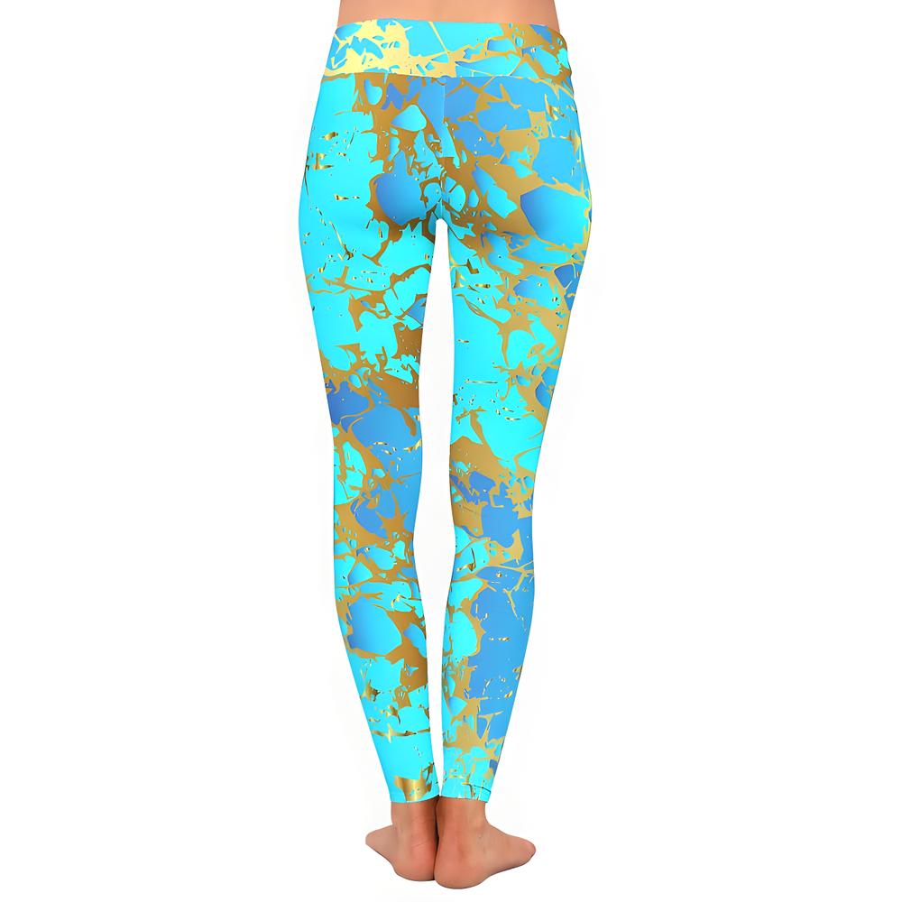 Make every step shimmer with leggings that channel sunlit water and liquid gold. A bold blue base is streaked with gilded accents for a look that feels fresh, playful, and just a little bit luxe. With a soft, flexible fit and a waistband that stays put, these leggings bring a splash of color and style to your everyday adventures—comfortable enough for lounging, striking enough to turn heads.
