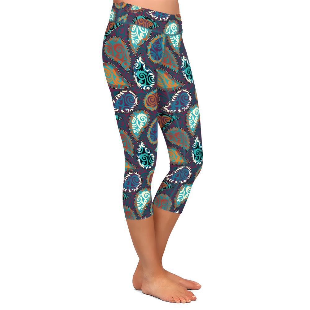 Step into effortless style with these capri leggings featuring a vibrant paisley-inspired pattern rich in teal, rust, and deep blue hues. Designed to catch the eye with its intricate swirls and bold shapes, this print brings a bohemian flair to your everyday wardrobe. Crafted for all-day comfort, these leggings offer a perfect blend of softness, stretch, and support that moves with you seamlessly—no pinching, no pulling, just flattering fit and dynamic design.