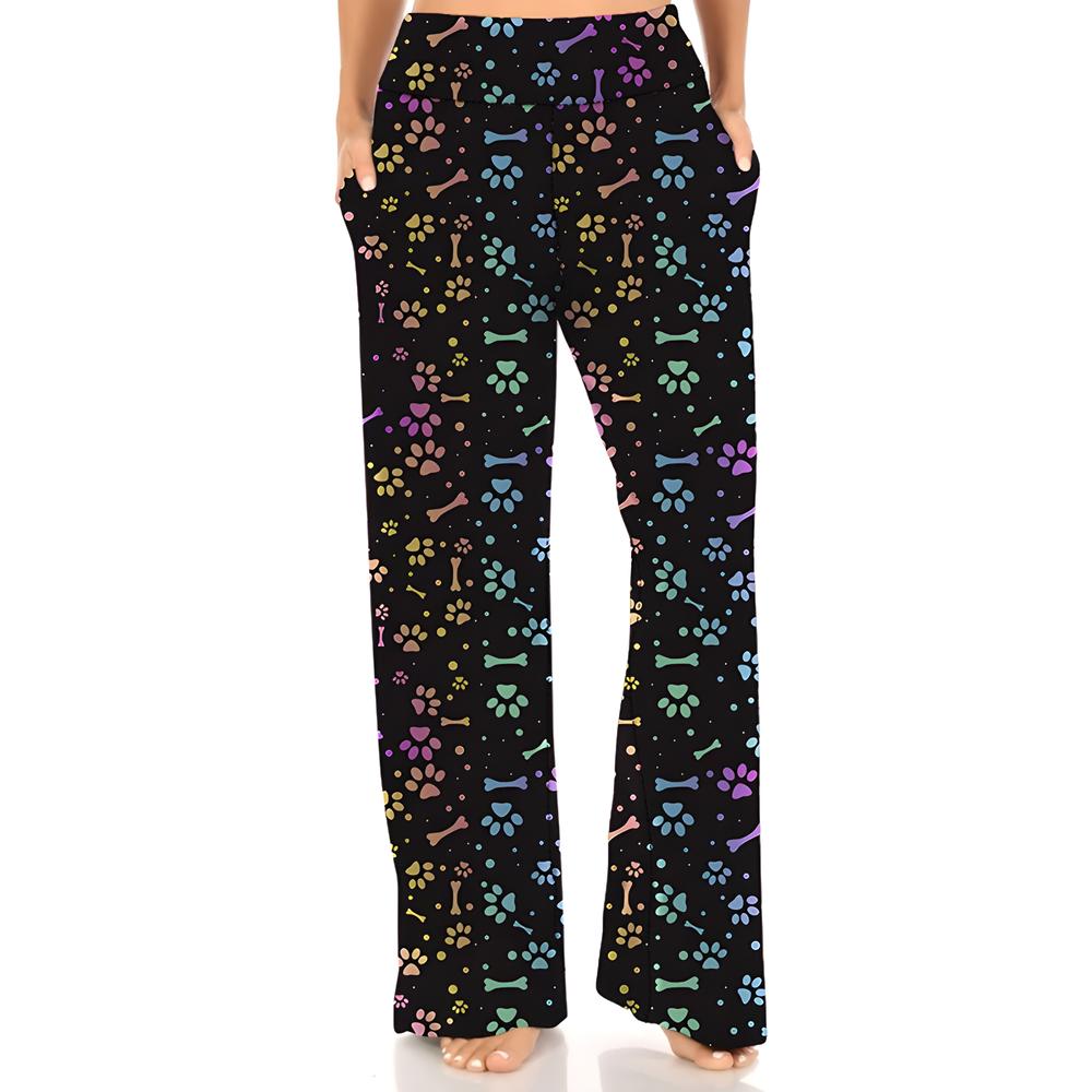 Step into playful charm with these wide-leg palazzos that celebrate your love for furry friends. The vibrant, multicolored paw prints and bones add a fun and whimsical touch against a sleek black backdrop, making each step a statement of joyful style. Designed for effortless comfort, their soft drape and flexible fit ensure you move with ease and confidence all day long.