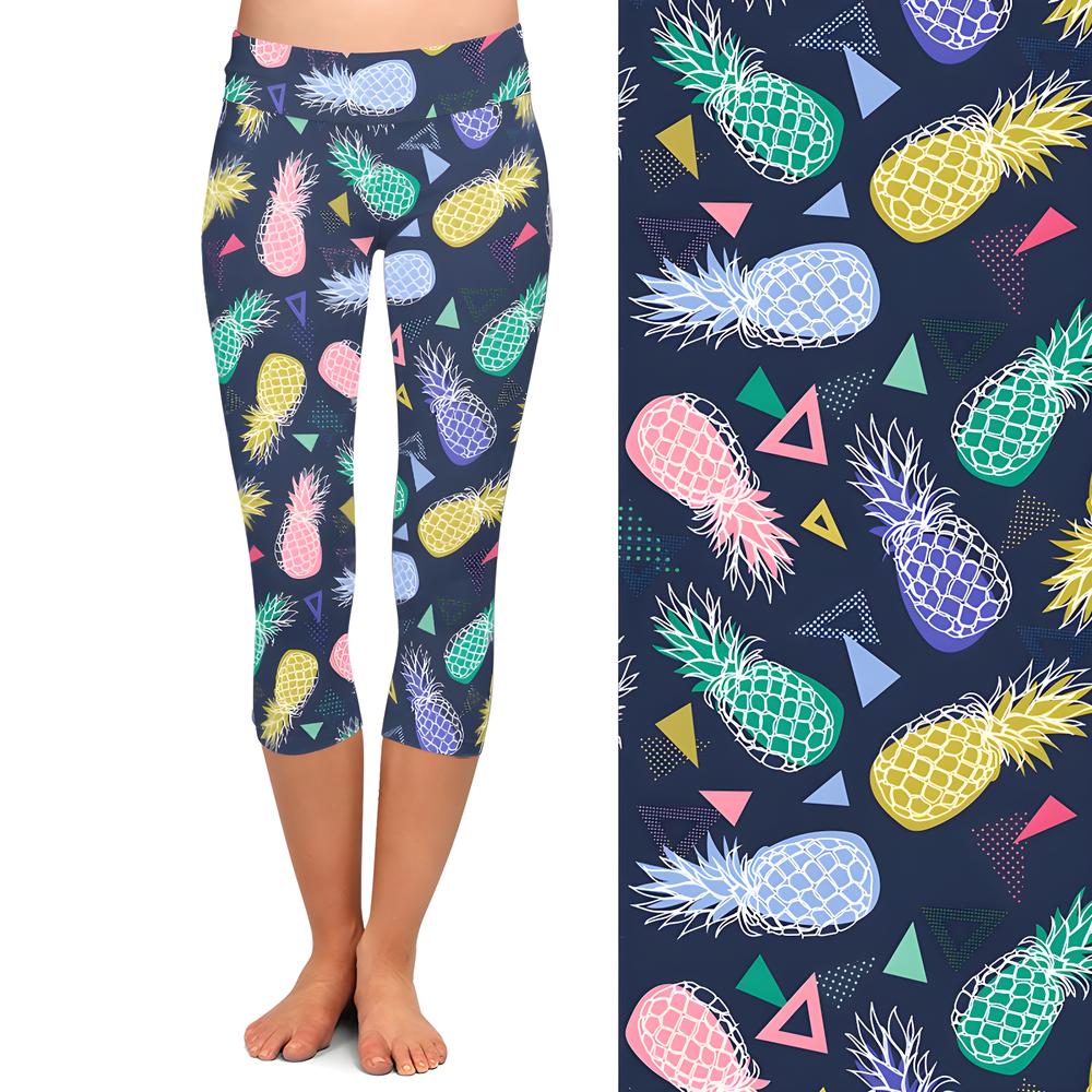Add a splash of tropical fun to your everyday wardrobe with these lively capri leggings. Featuring a vibrant pineapple print in a playful mix of pastel and bold colors against a deep navy backdrop, they bring a fresh, upbeat vibe to any outfit. Designed with an ultra-soft fabric that stretches and supports without pinch or pull, these leggings offer all-day comfort and a flattering fit that moves effortlessly with you.
