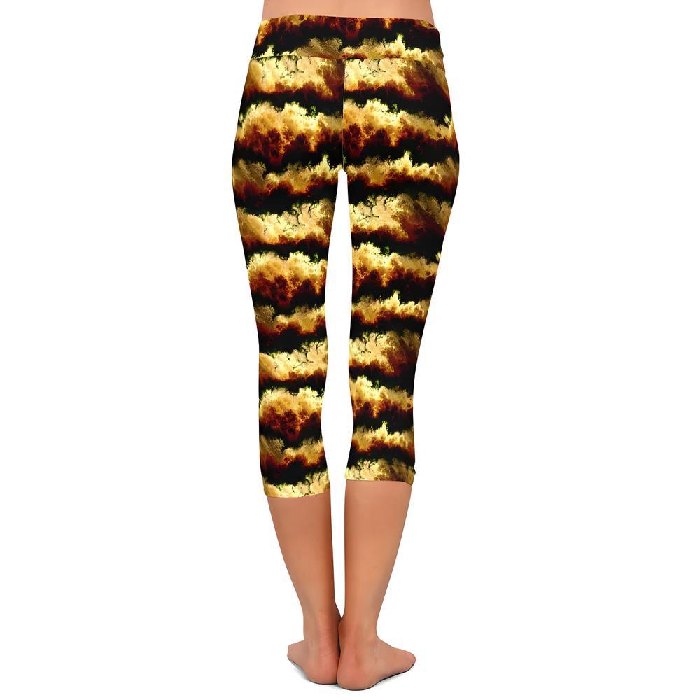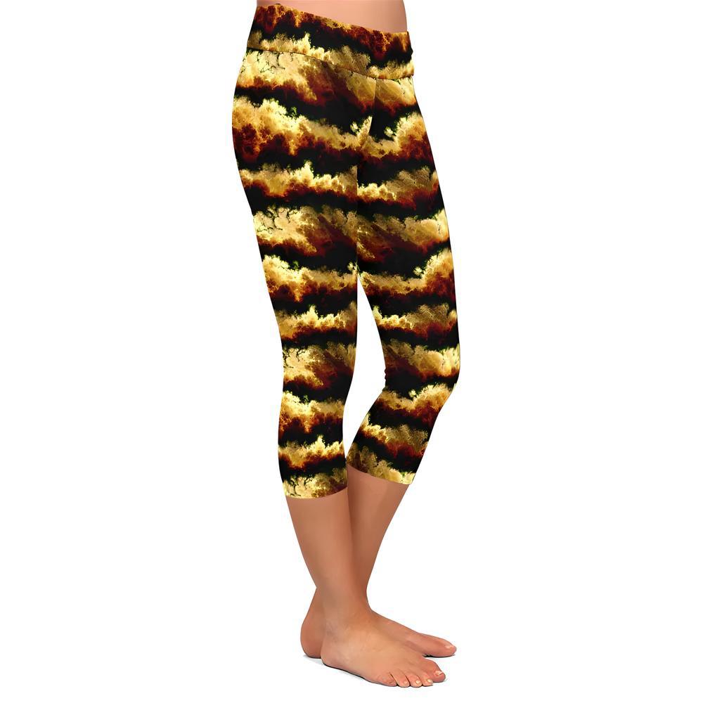 Step into a world of bold style and vibrant warmth with these striking capri leggings. Featuring a dynamic pattern reminiscent of glowing sunsets and fiery skies, they add a splash of artistic energy to your everyday look. Crafted for all-day comfort, these ultra-soft leggings offer a flawless blend of stretch and support that moves effortlessly with you—no pinching, no pulling, just pure ease and confidence.