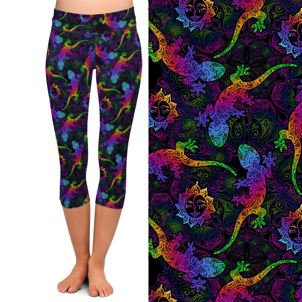 Step into a world of vibrant expression with these capri leggings that showcase a stunning kaleidoscope of neon geckos intertwined with whimsical sun motifs. Designed to keep up with your every move, they offer an unbeatable blend of softness, stretch, and support that feels like a second skin. Slip into these eye-catching leggings and let your style shine with a playful, colorful edge that turns heads wherever you go.