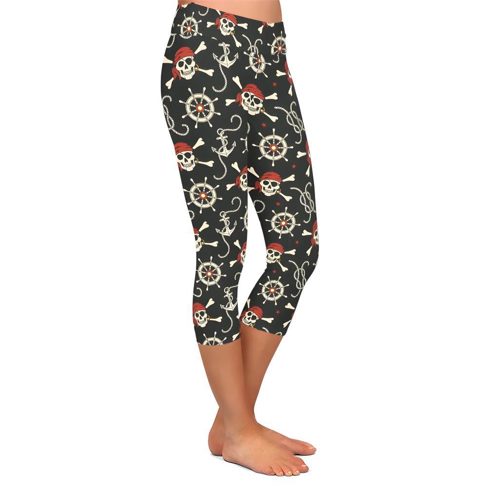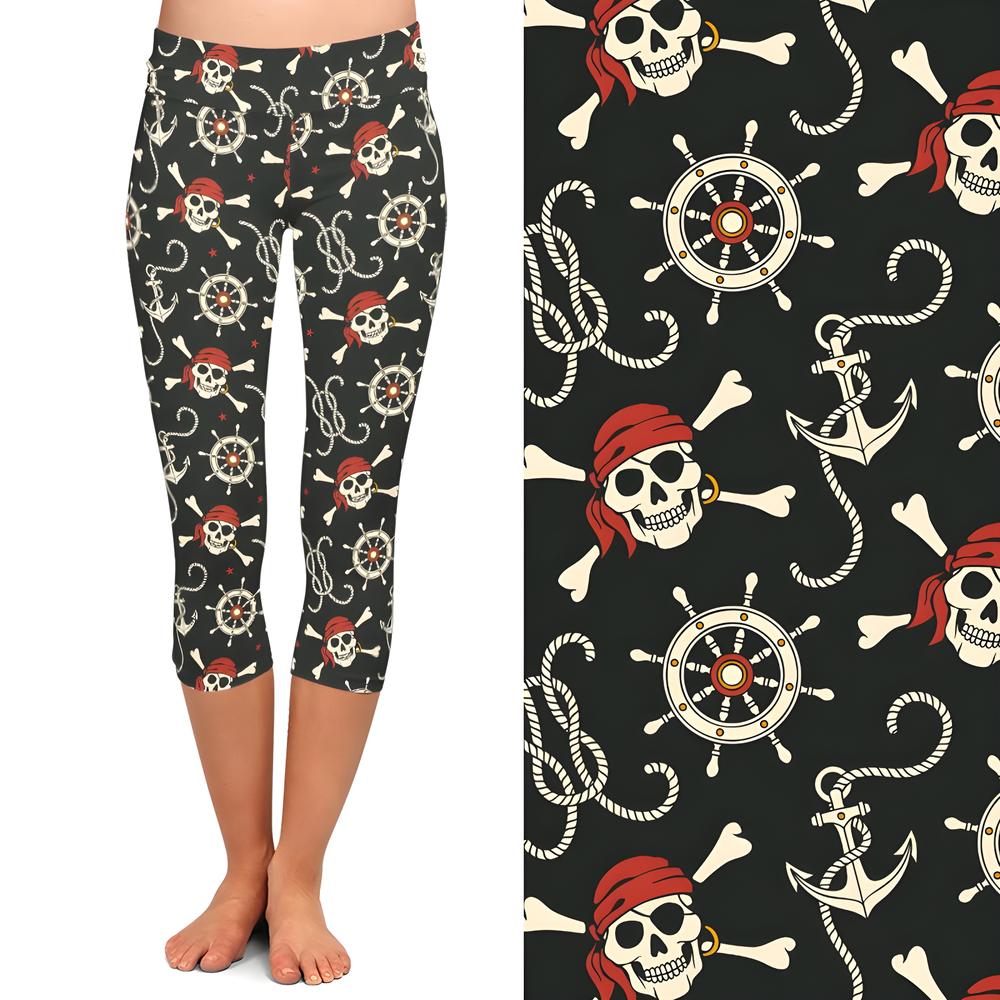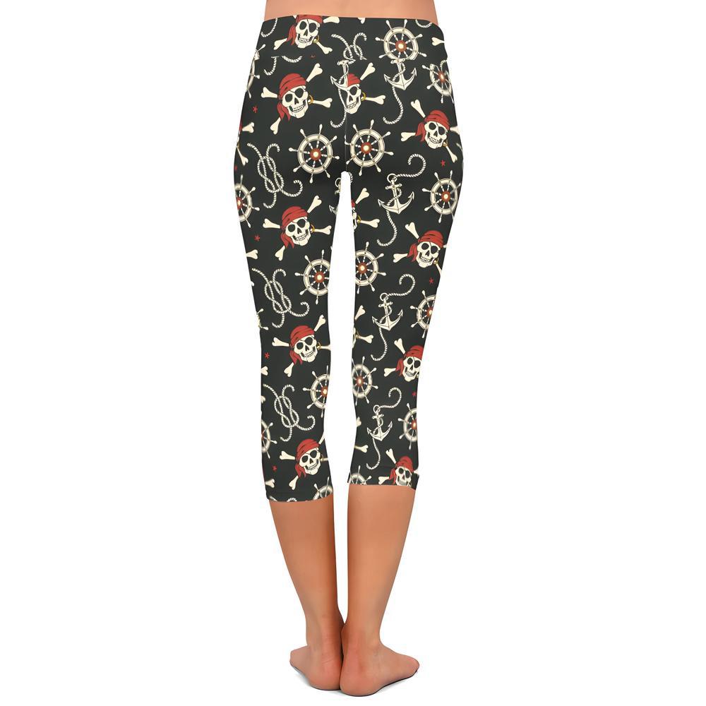Set sail on a style adventure with these capri leggings featuring bold pirate-inspired skulls, anchors, and ship wheels. Designed for all-day wear, they blend soft fabric with just the right amount of stretch and support to keep you comfortable and confident. With a playful nautical pattern, these leggings add a daring edge to your everyday wardrobe—effortlessly cool and uniquely you.