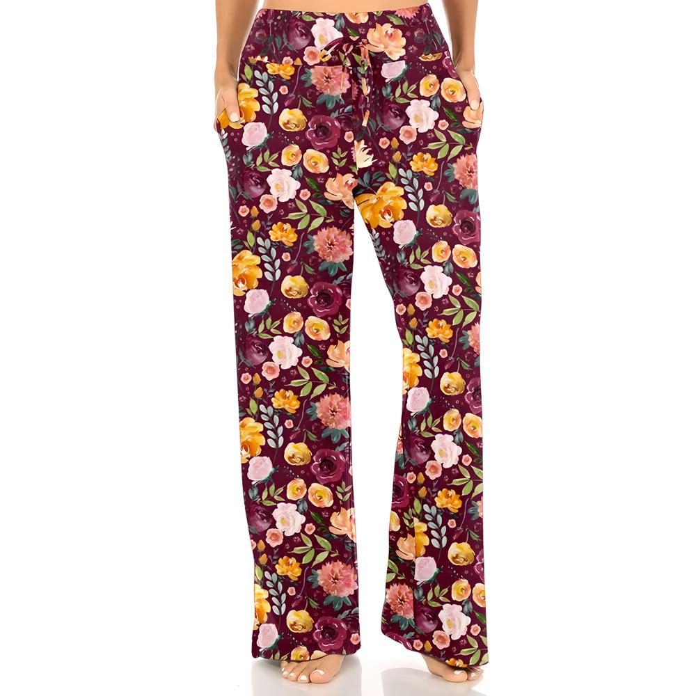 Step into a world of vibrant elegance with these wide-leg palazzo leggings, featuring a rich floral tapestry in deep burgundy, accented by bursts of warm yellows and soft pinks. Designed to bring a fresh pop of color and a touch of nature’s beauty to your everyday wardrobe, they offer a soft drape and smooth waistband for effortless wear. Whether you’re out and about or relaxing at home, their breathable fabric and flexible fit ensure you move with ease and confidence.