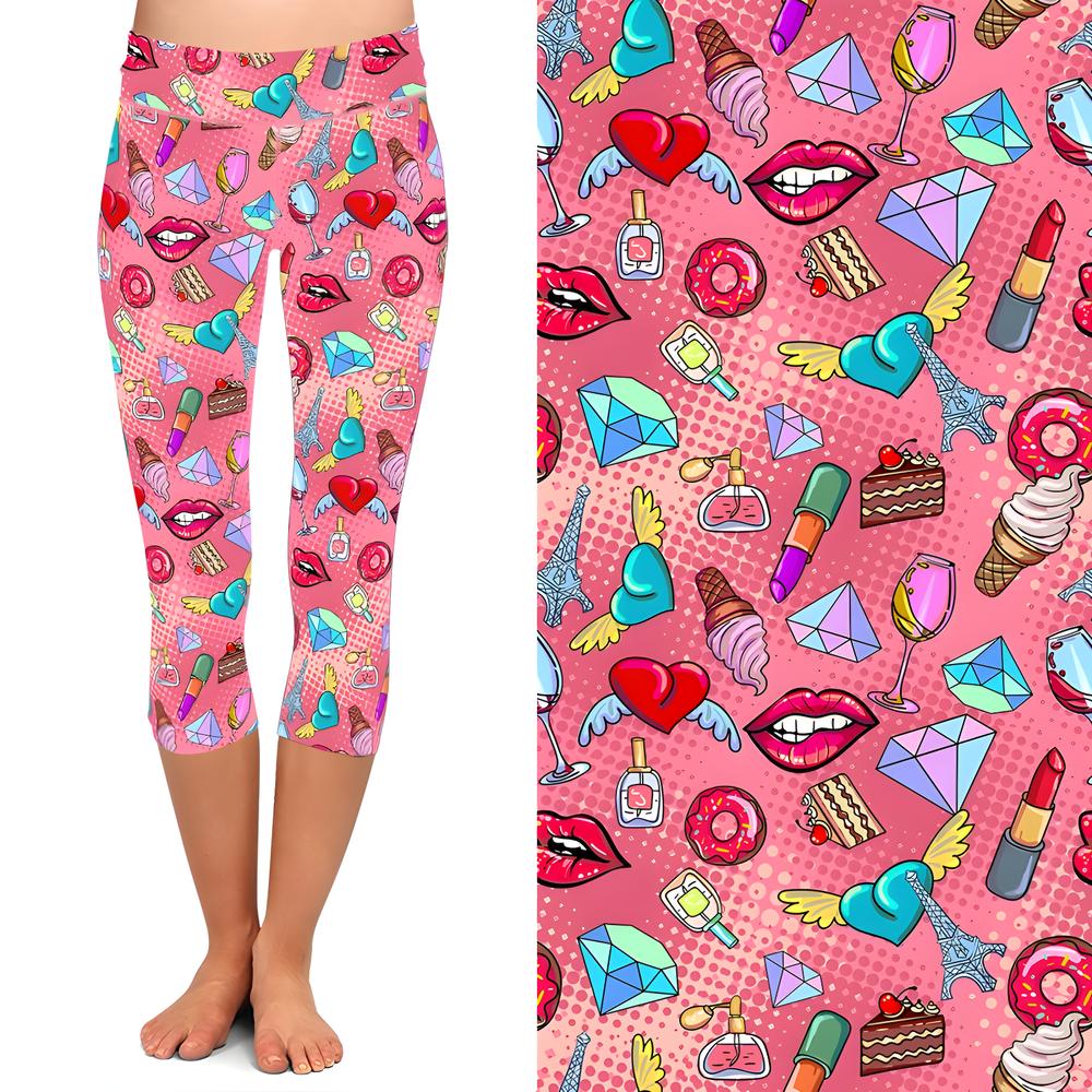 Step into a world of playful charm and vibrant color with these capri leggings that showcase a whimsical pop art design. Bursting with fun motifs like lips, hearts, diamonds, and sweet treats, each pair adds a bold statement to your everyday wardrobe. Crafted for all-day comfort, they blend softness, stretch, and support perfectly—ensuring you feel as fabulous as you look, no matter where your day takes you.