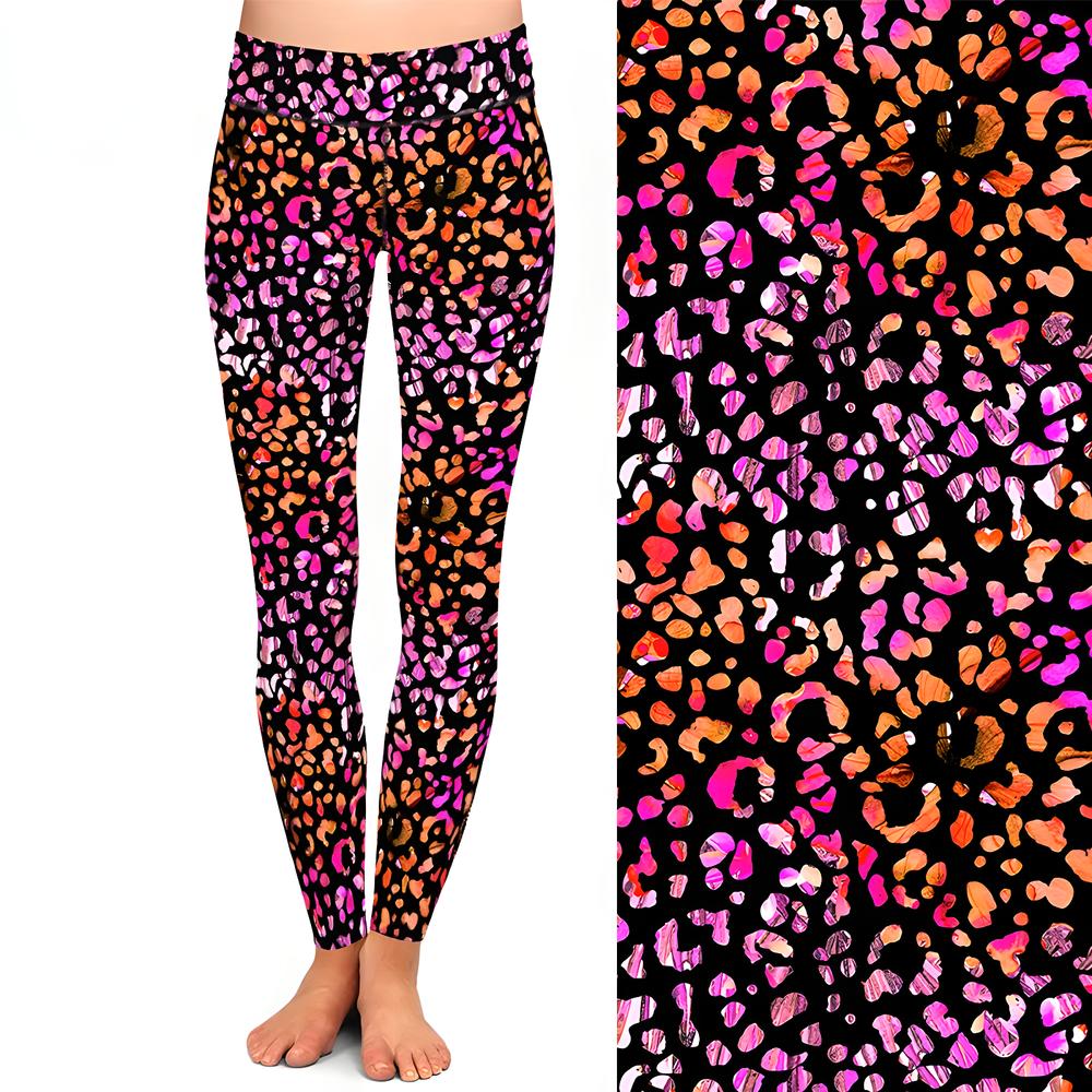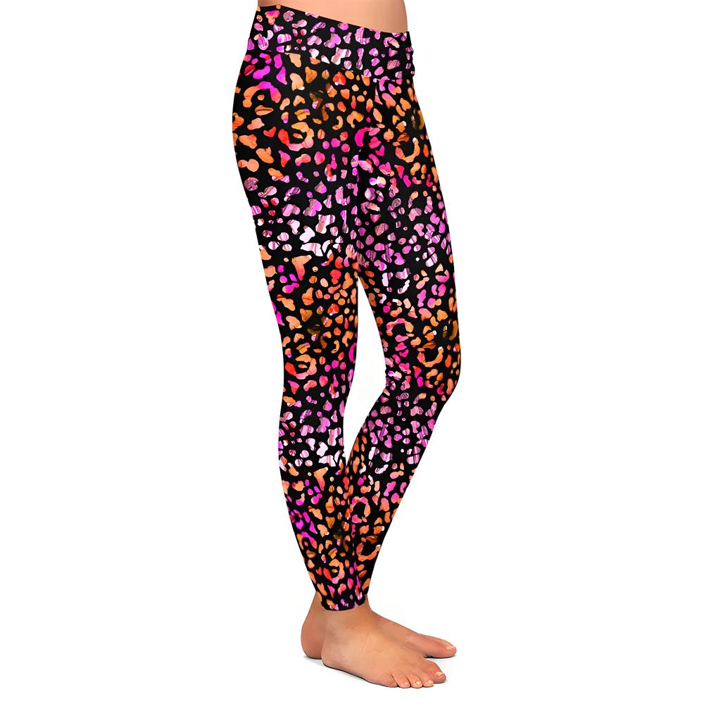 Unleash your wild side with leggings that roar confidence and style. Featuring a vibrant leopard print in bold pinks, oranges, and purples against a sleek black backdrop, these leggings turn everyday wear into a statement. Crafted for supreme softness and stretch, they move effortlessly with you, providing a flattering fit and breathable comfort from dawn till dusk. Experience the perfect blend of playful design and all-day ease that you’ll never want to take off.