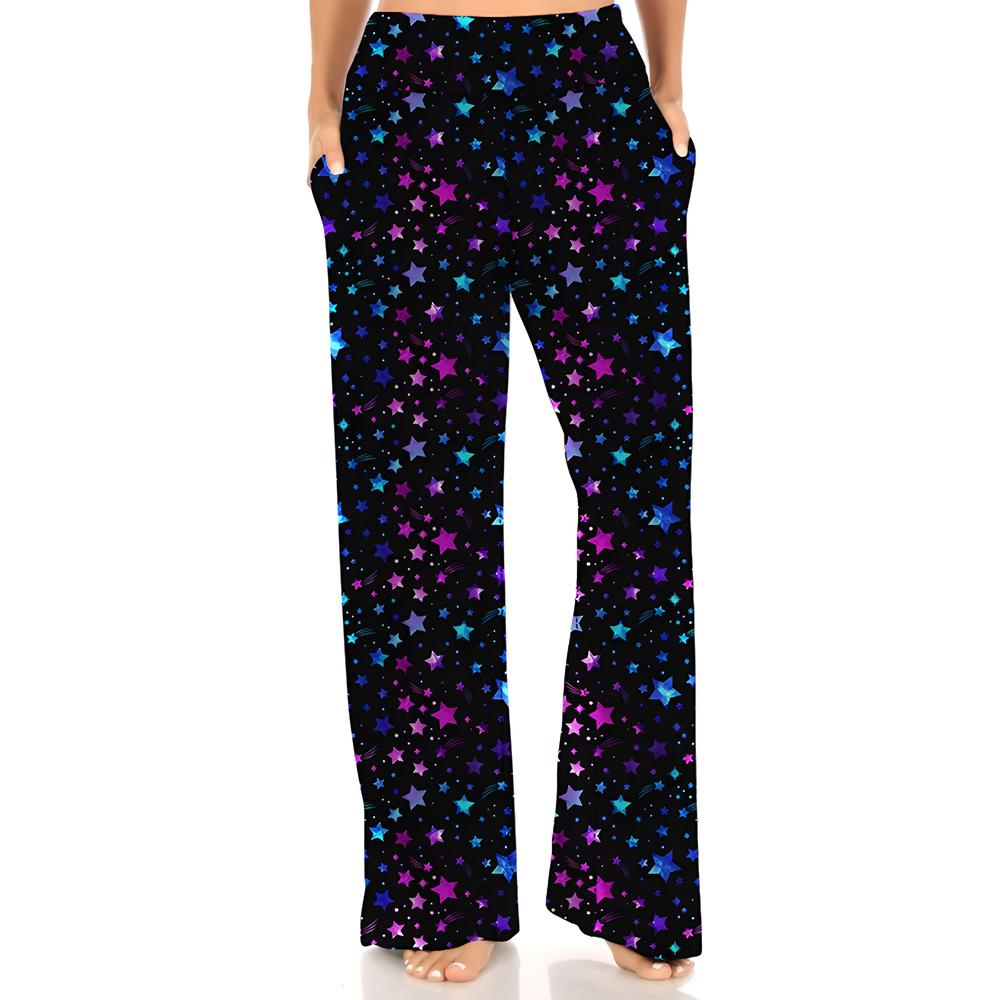 Step into a universe of vibrant color and playful charm with these wide-leg palazzo leggings, adorned with a dazzling array of stars in rich blues, purples, and pinks against a sleek black backdrop. Perfectly blending cosmic whimsy with everyday ease, their soft drape and flexible fit ensure you stay comfortable while making a bold style statement. Whether you’re relaxing at home or out on the town, these leggings bring a touch of magic and effortless confidence to your wardrobe.