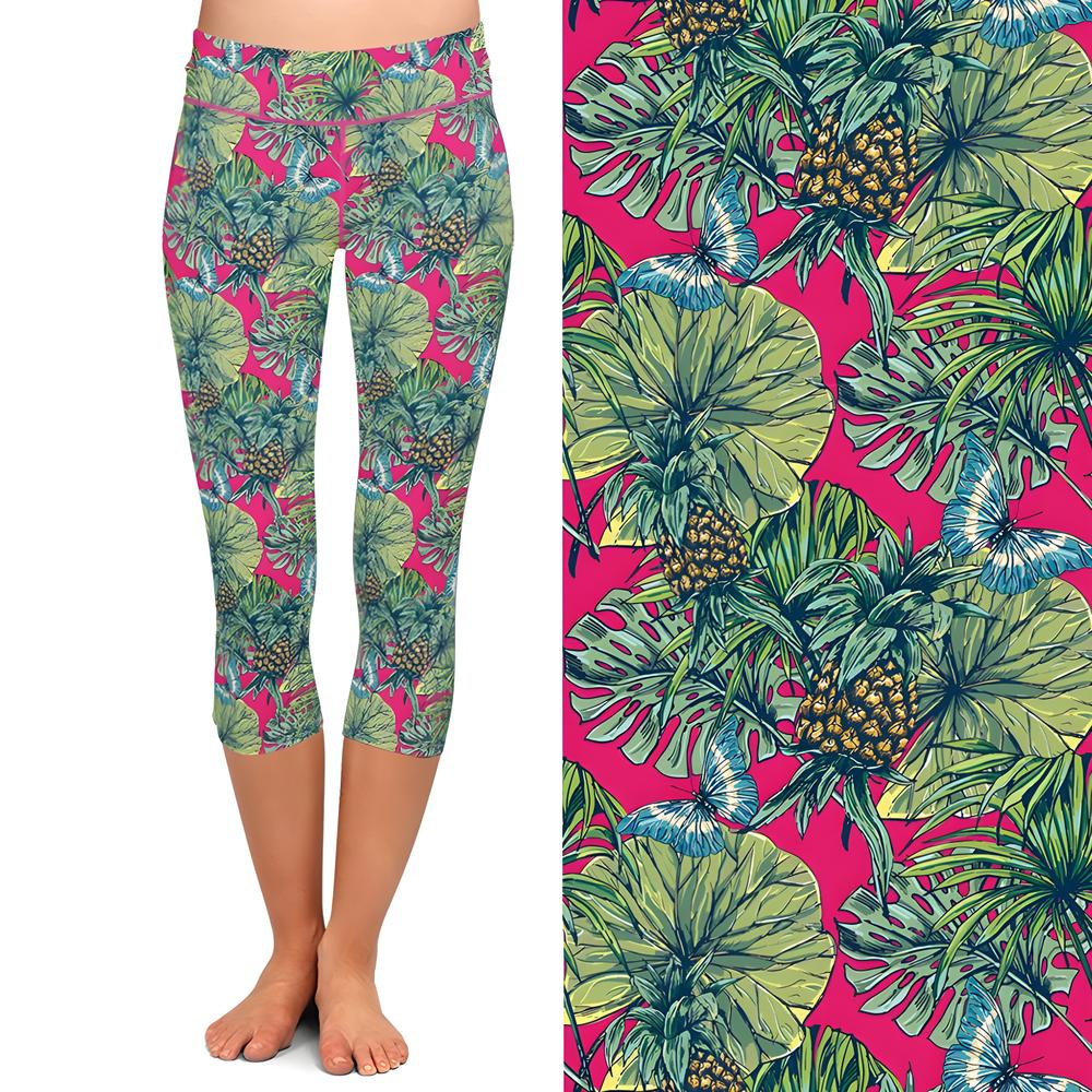 Step into a vibrant tropical paradise with these capri leggings that feature lush green leaves, ripe pineapples, and delicate blue butterflies set against a bold pink background. Designed to brighten your day, they combine everyday comfort with a playful, eye-catching print that adds a splash of sunshine to your wardrobe. Crafted for softness, stretch, and support, these leggings promise a flattering fit that moves effortlessly with you—no pinching, no pulling, just pure ease and style.
